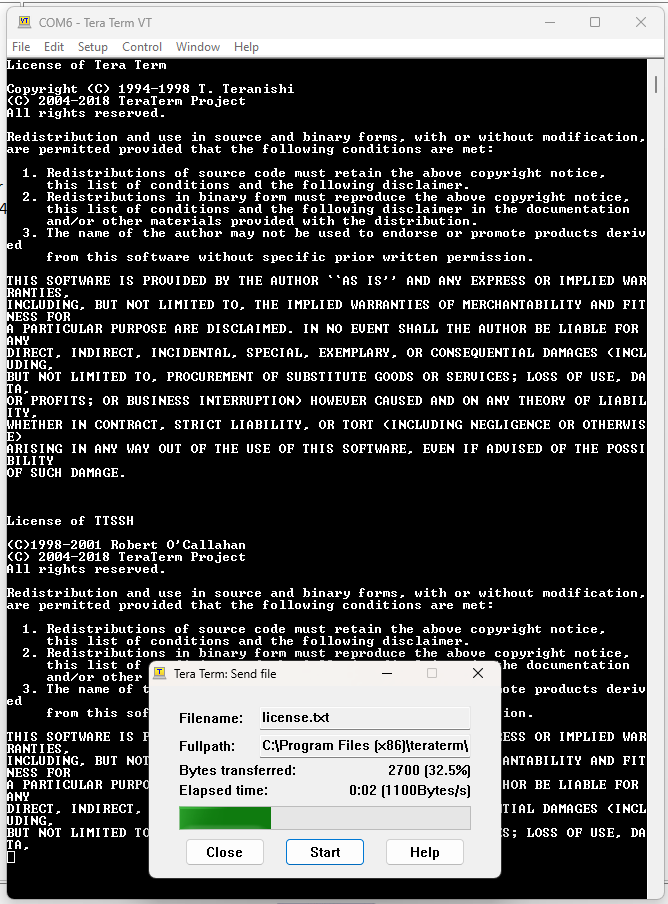 Test the BB Computer: The screenshot on the right shows the UART setup up to echo the user's keystrokes. The user has used Tera Term Send File function under the File column to send the license.txt file at 9600bps. This required a minor change to the code such that the Divisor in line 49 was changed from $60 to $0C to increase the speed from 1200bps to 9600bps.