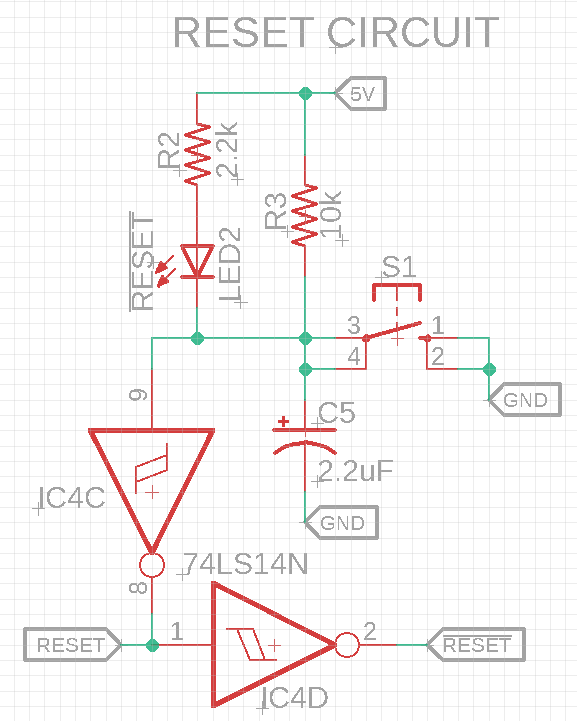 UART (Universal Asynchronous Receiver Transmitter): There are a few different UARTs we could use for serial communication but we have had good success with the PC16550DN device. Which is more than can be said for the WDC65c51 ACIA that had a transmit bug. The UART will take our bytes, turn then into bits and them send them sequentially out any attached interface to our PC via a USB RS232/FTDI adaptor. While looking at the UART pinout diagram below we noticed pin 35 is Master Reset, MR, but it's active high whereas the Z80 CPU MR is active low. To the right of the pinout we have changed our schematic to include two spare 7414 inverter/NOT gates to accommodate both the CPU and UART: the first NOT gate connects to the UART and the second NOT gate connects to the CPU. When the reset switch is pressed, the UART is reset and is the CPU.